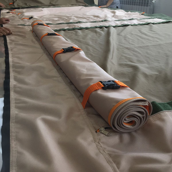ЮБКА — нижняя часть палатки выполнена из материала с поливинилхлоридовым покрытием 4000 мм водяного столба торцевого крепления к каркасу малого подиума, который расположен внутри жилой зоны, что полностью защищает от проникновения воды по помосту во время порывистого дождя и проливных дождей. Морозостойкость и теплоустойчивость t -50C +110C.