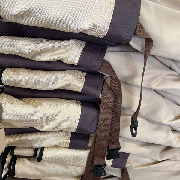 ПАЛАТКА — состоит из инновационного трёхкомпонентного, морозостойкого и влагостойкого архитектурного текстиля. Верхняя часть палатки бежевого цвета панамского плетения, нижняя часть темно-коричневого цвета из водонепроницаемого текстиля, внутренняя часть песчаного цвета из интерьерного текстиля, который придаёт комфортные условия для пребывания гостей.